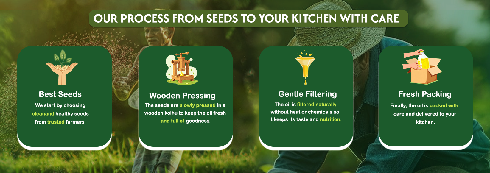 Each bottle carries the essence of rural Rajasthan — where handpicked seeds are wooden-pressed using traditional Lakdi Ghani methods. Pure, unrefined, and packed with natural goodness for your everyday kitchen.